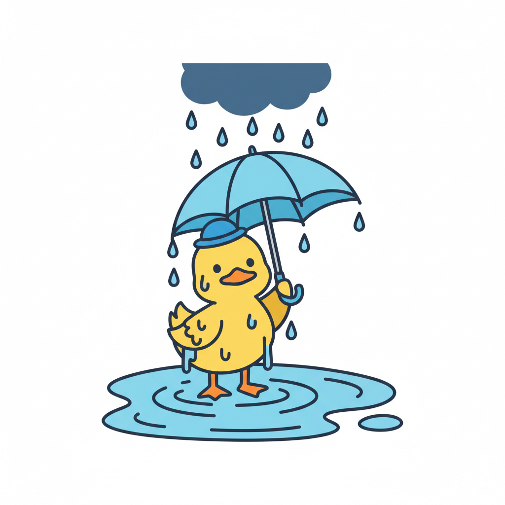 Niedliches gelbes Entlein mit blauem Regenschirm steht im Regen in einer Pfütze.