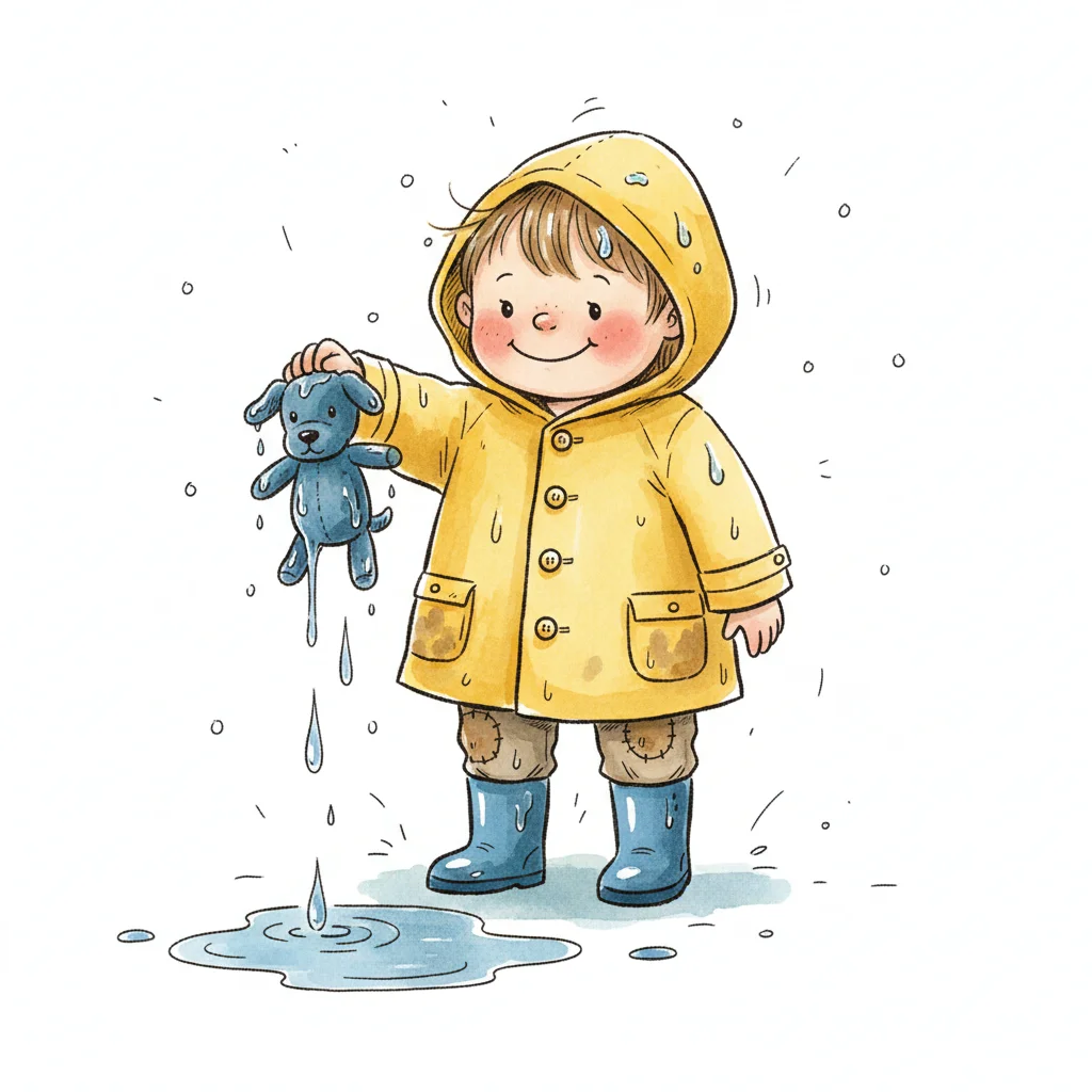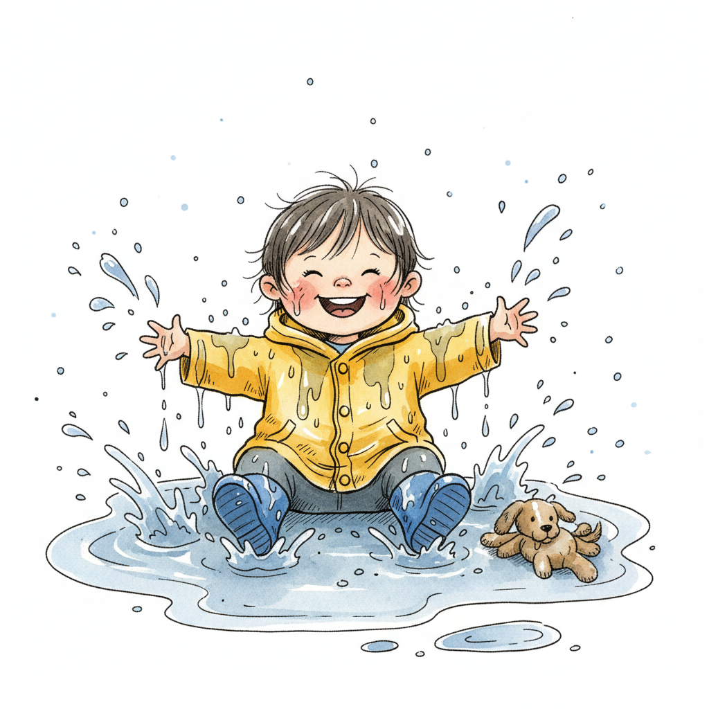 Fröhliches Kind in gelbem Regenmantel planscht lachend in einer Pfütze mit Stoffhund.