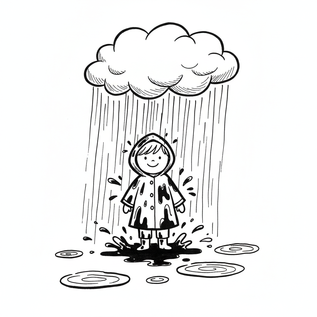 Glückliches Kind im Regenmantel spielt fröhlich in Pfützen unter einer Wolke, die regnet.