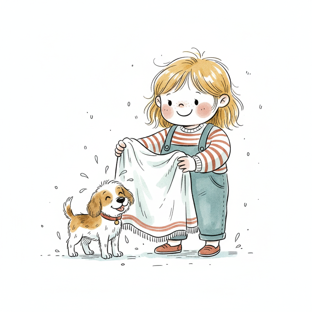 Niedliche, kindgerecht illustrierte Szene mit einem Kind oder einer Person als Hauptfigur, vor rein weißem Hintergrund, im frech-nordischen Aquarell-Skizzenstil. Klare, leicht wackelige Tuschekonturen, sichtbare Pinsel- und Strichtextur, dezente Schraffuren, weiche handgemalte Farbflächen in gedeckten Farben. Einfache, runde Formen. Keine harten Schatten, sondern sanfte, transparente Aquarellschichten. Leicht raue, handgezeichnete Linien statt glatter Vektorkanten. Subtile, vereinzelte Kritzelpunkte oder kleine Details im Hintergrund (wie Pünktchen oder feine Striche), aber keine echte Umgebung oder Landschaft. Die Figur ist mittig zentriert. Insgesamt charmant, humorvoll, warm und handgemacht wirkend. WICHTIG: Das Bild darf ABSOLUT KEINEN TEXT, KEINE BUCHSTABEN und KEINE ZAHLEN enthalten.