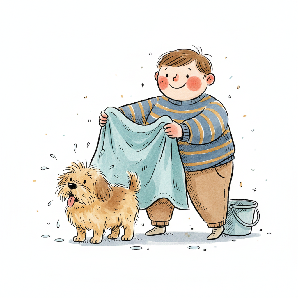 Ein Junge trocknet einen nassen, flauschigen Hund mit einem blauen Handtuch. Der Hund ist fröhlich.