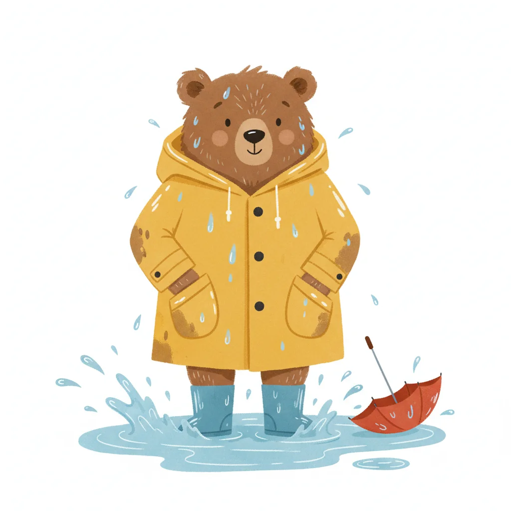 Niedlicher Bär in gelbem Regenmantel und blauen Stiefeln planscht fröhlich in einer Pfütze.
