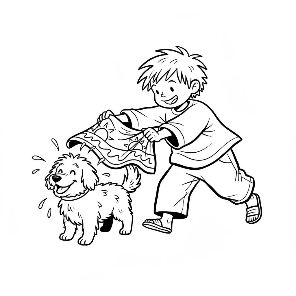 Fröhlicher Junge bedeckt spielerisch einen nassen Hund mit einem Tuch.