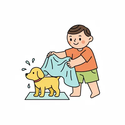 Ein Junge trocknet einen nassen Hund mit einem Handtuch. Der Hund steht auf einer Matte.