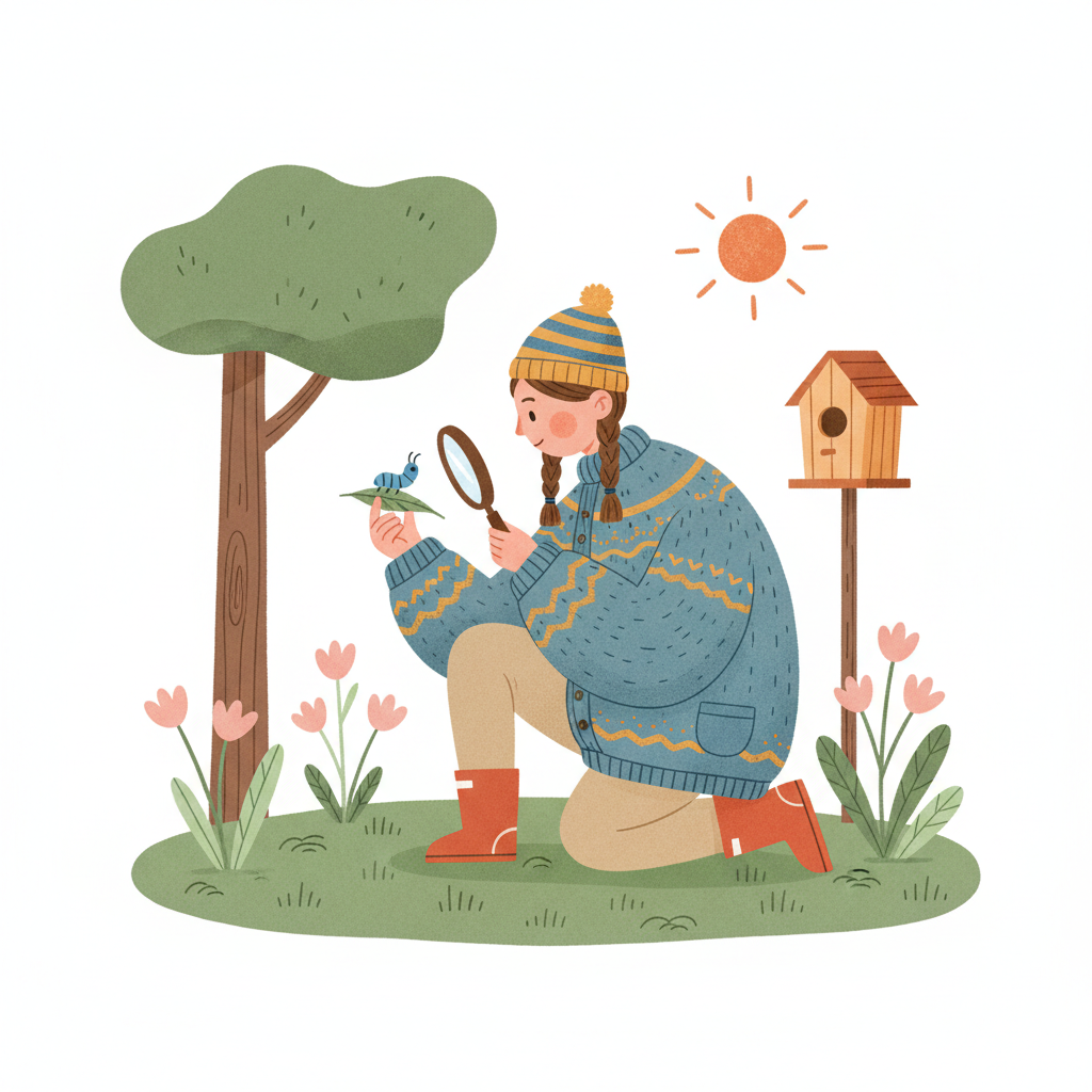 Ein Mädchen kniet im Garten und untersucht mit einer Lupe ein kleines Insekt auf einem Blatt.