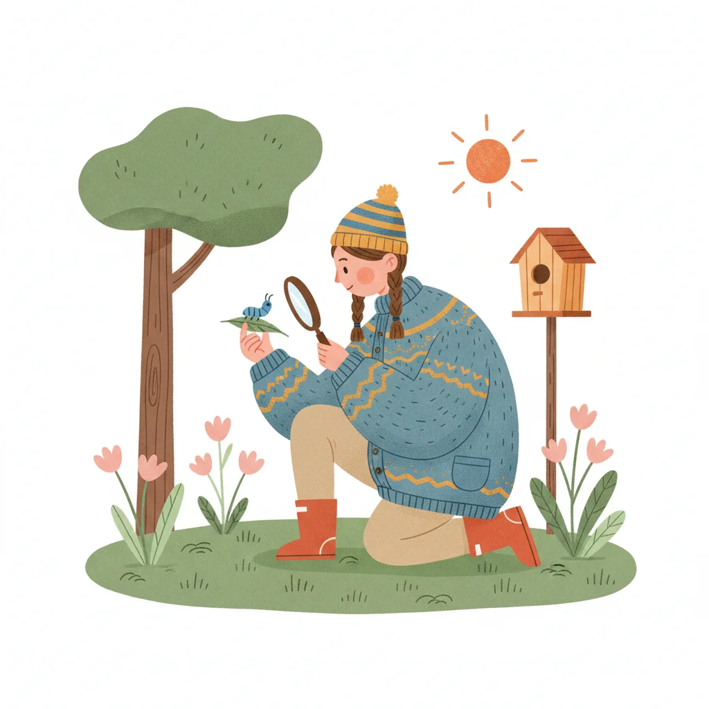 Kind zeichnet Naturbeobachtungen in Notizbuch, mit Fernglas, Käfer und Feder.