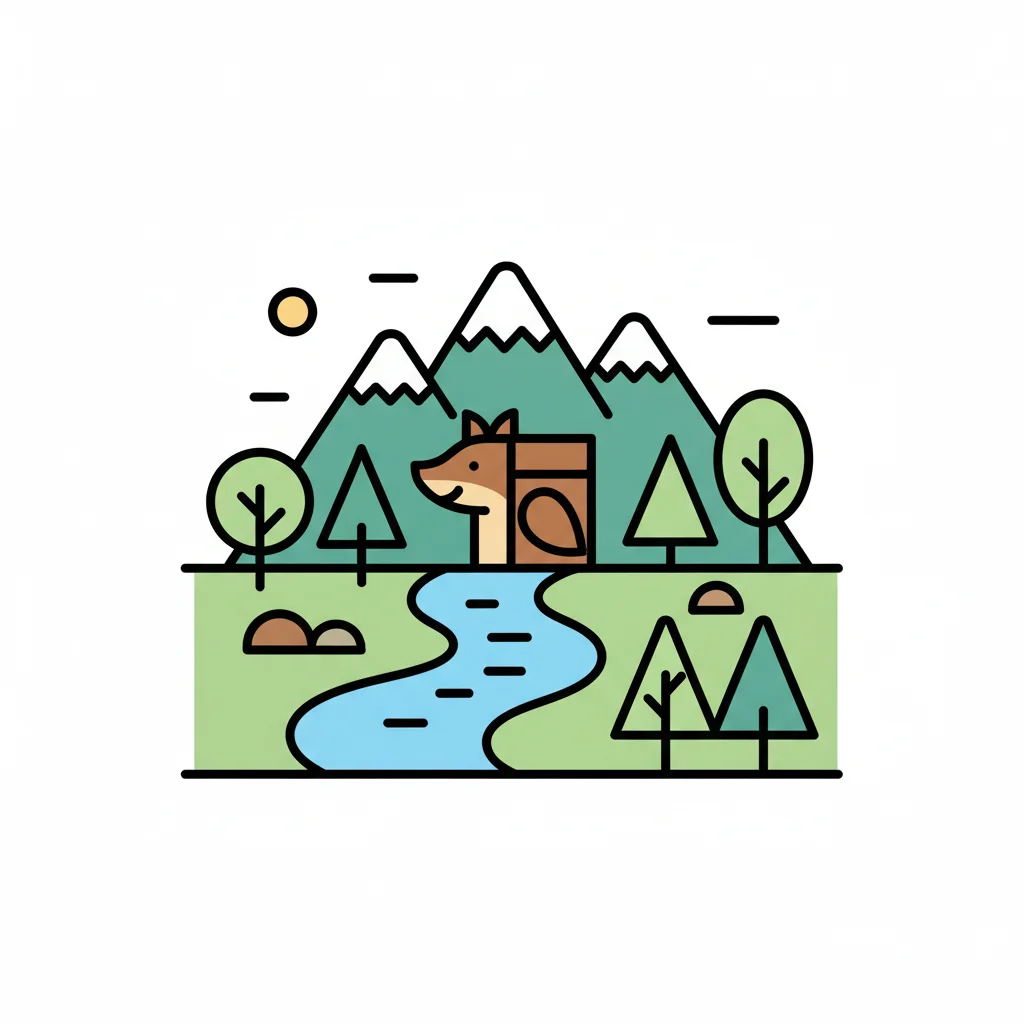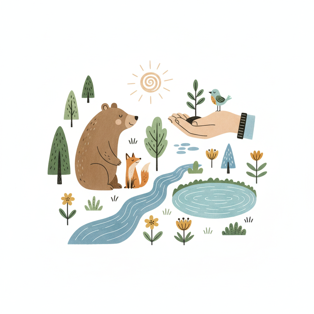 Niedliche Cartoon-Illustration von Waldtieren (Fuchs, Bär, Vogel) in einer Hügellandschaft mit Fluss und Bäumen.