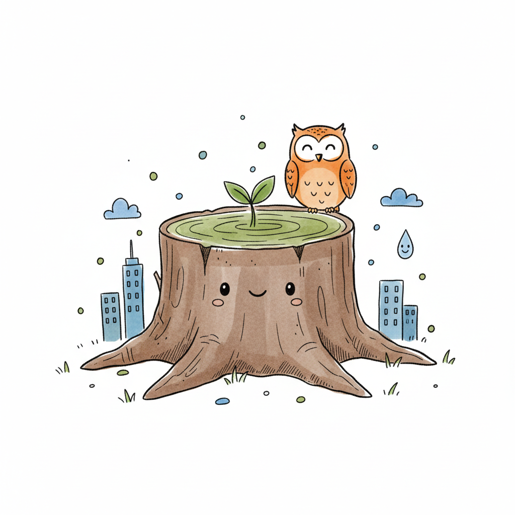 Niedlicher Baumstumpf mit Spross und Eule, umgeben von Stadtgebäuden. Symbolisiert Natur in der Stadt.