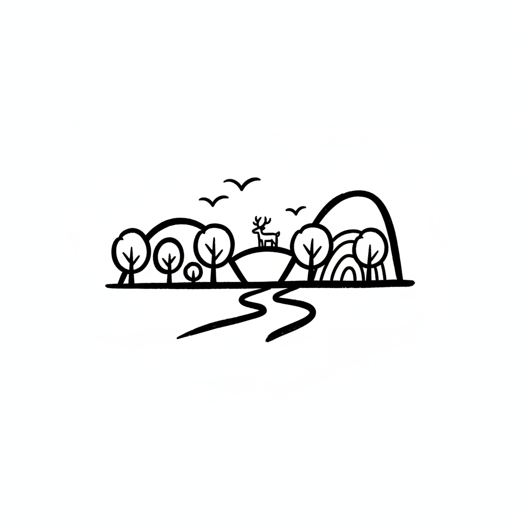 Minimalistische Strichzeichnung einer Landschaft mit Hügeln, Bäumen, einem Hirsch, Vögeln und einem Fluss.