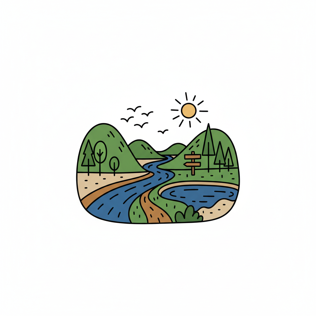 Cartoon-Illustration einer Flusslandschaft mit Hügeln, Bäumen, See, Sonne und Vögeln.