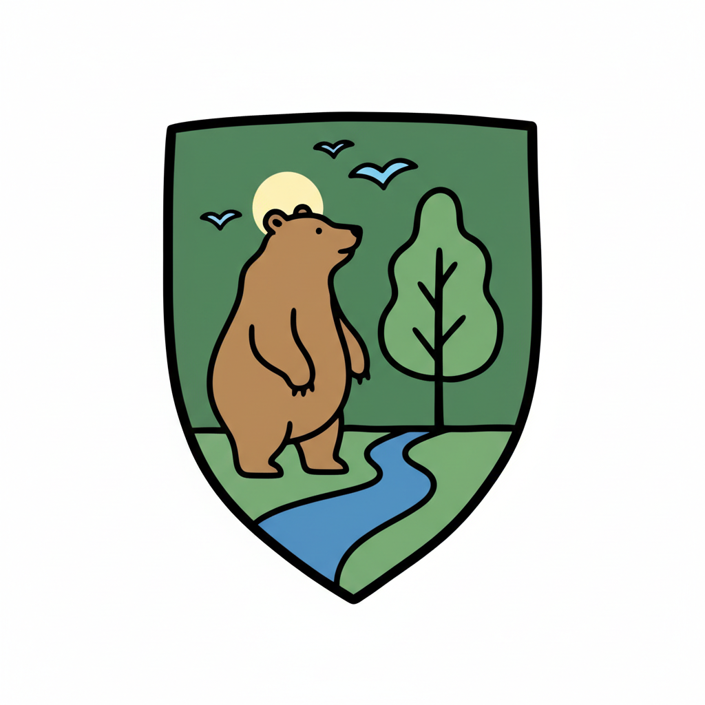 Stilisiertes Wappen mit Bär, Fluss, Baum, Sonne und Vögeln in grüner Natur.