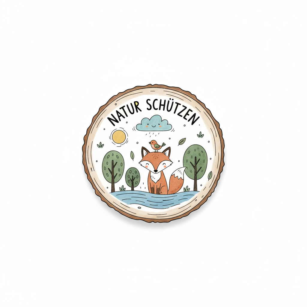 Handgezeichnetes Logo "Natur schützen" mit Fuchs, Vogel, Fisch und Baum, symbolisiert Umweltschutz.
