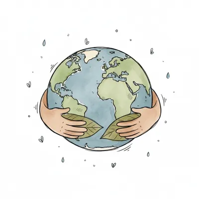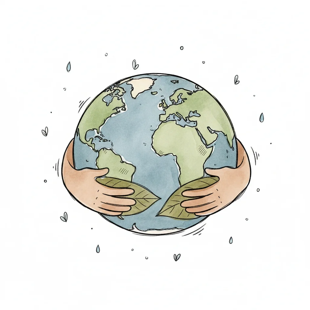 Hände umarmen die Erde mit Blättern, ein Symbol für Umweltschutz und Nachhaltigkeit.