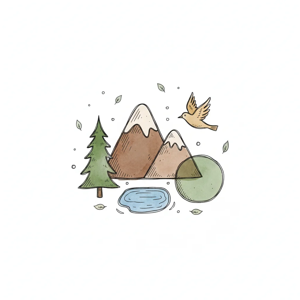 Stilisierte Naturillustration: Berge, Baum, See, Vogel und Blätter in sanften Farben.