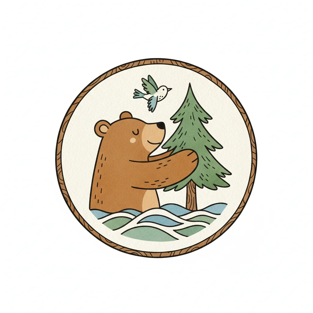 Niedlicher Cartoon-Bär umarmt einen Baum, mit einem Vogel und Wellen in einem runden Rahmen.