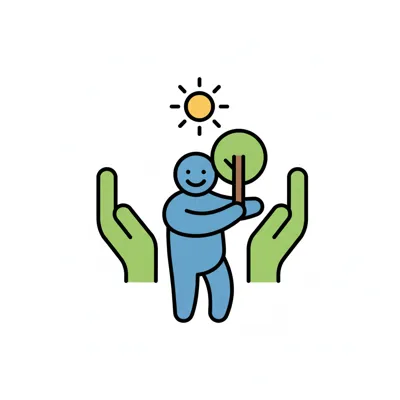 Cartoonfigur pflanzt Baum unter Sonne, umgeben von schützenden Händen. Symbol für Umweltschutz.
