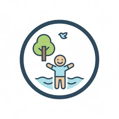 Glücklicher Mensch in der Natur mit Baum, Vogel und Wasser, umgeben von einem Kreis.