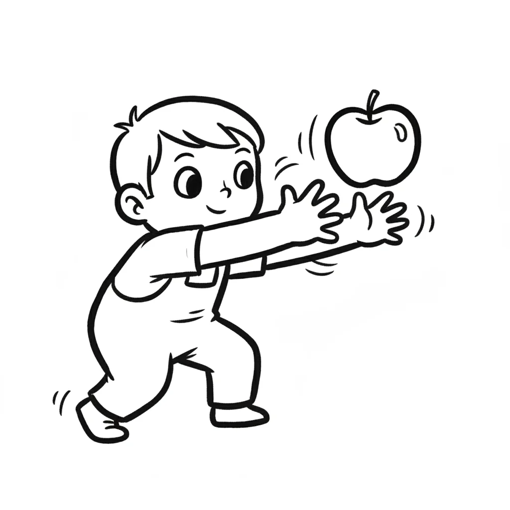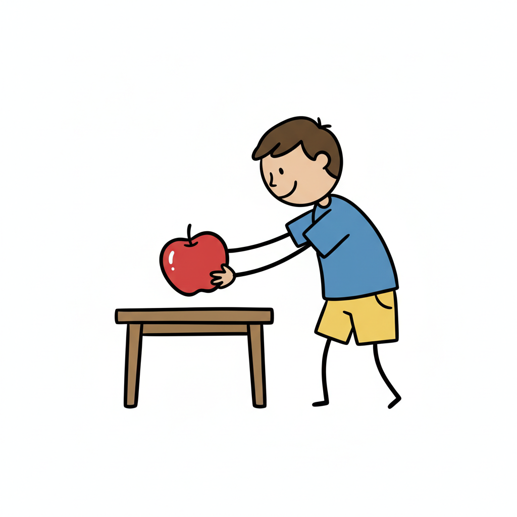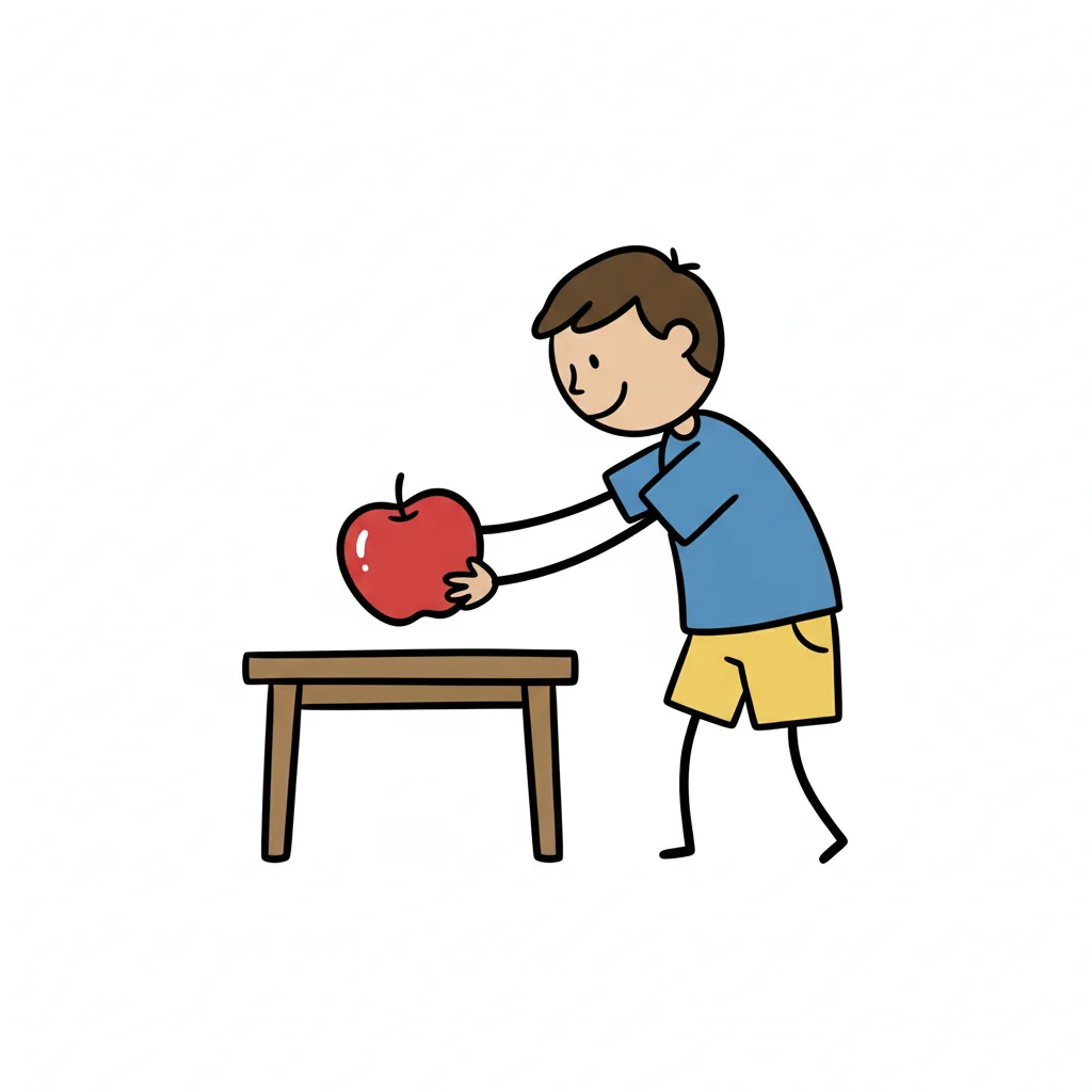 Ein Kind zieht einen roten Apfel auf einem Tisch.