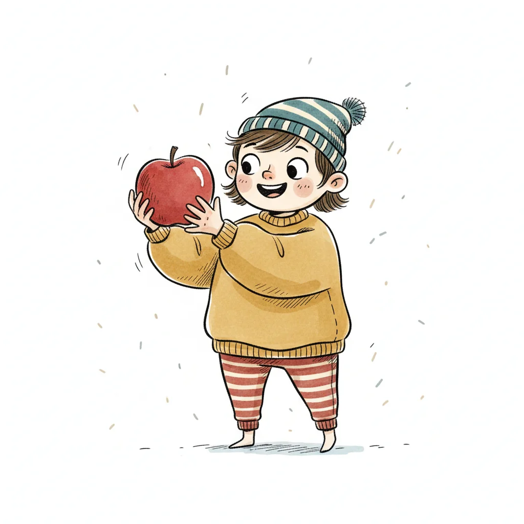 Niedliche, kindgerecht illustrierte Szene mit einem Kind oder einer Person als Hauptfigur, vor rein weißem Hintergrund, im frech-nordischen Aquarell-Skizzenstil. Klare, leicht wackelige Tuschekonturen, sichtbare Pinsel- und Strichtextur, dezente Schraffuren, weiche handgemalte Farbflächen in gedeckten Farben. Einfache, runde Formen. Keine harten Schatten, sondern sanfte, transparente Aquarellschichten. Leicht raue, handgezeichnete Linien statt glatter Vektorkanten. Subtile, vereinzelte Kritzelpunkte oder kleine Details im Hintergrund (wie Pünktchen oder feine Striche), aber keine echte Umgebung oder Landschaft. Die Figur ist mittig zentriert. Insgesamt charmant, humorvoll, warm und handgemacht wirkend. WICHTIG: Das Bild darf ABSOLUT KEINEN TEXT, KEINE BUCHSTABEN und KEINE ZAHLEN enthalten.