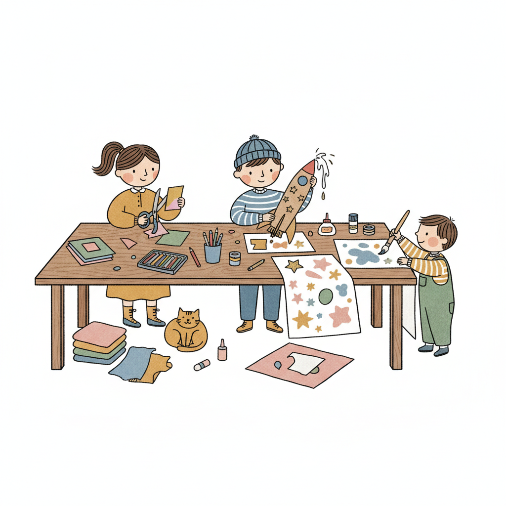 Drei Kinder basteln kreativ am Tisch: schneiden, kleben, malen. Eine Katze beobachtet sie.