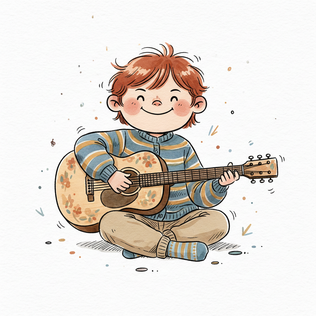 Ein lächelnder Cartoon-Junge mit roten Haaren spielt Gitarre, sitzt im Schneidersitz.
