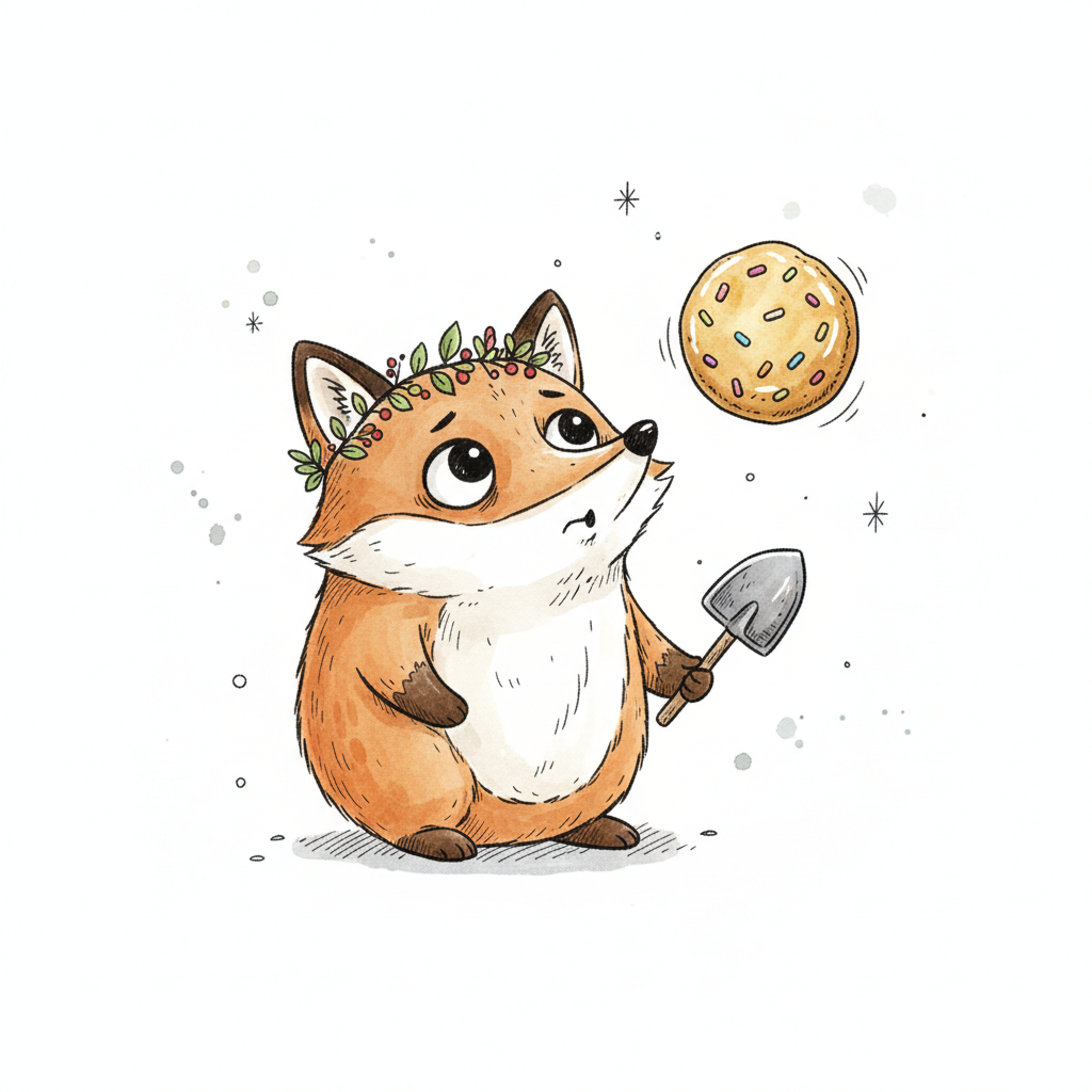 Niedlicher Fuchs mit Schaufel und Beerenkranz schaut sehnsüchtig auf einen schwebenden Keks.
