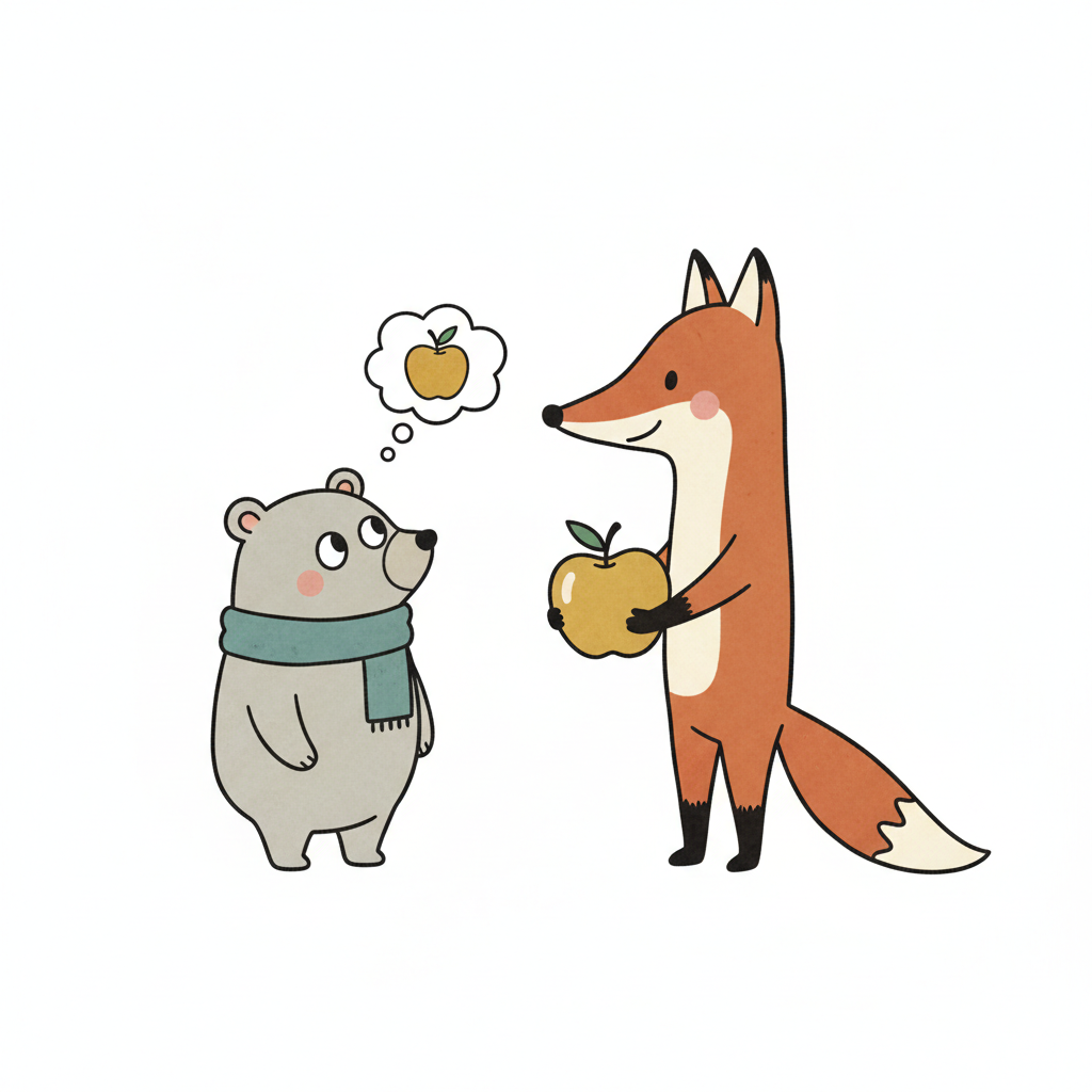 Fuchs bietet Bären Apfel an, Bär träumt davon. Süße Cartoon-Illustration.