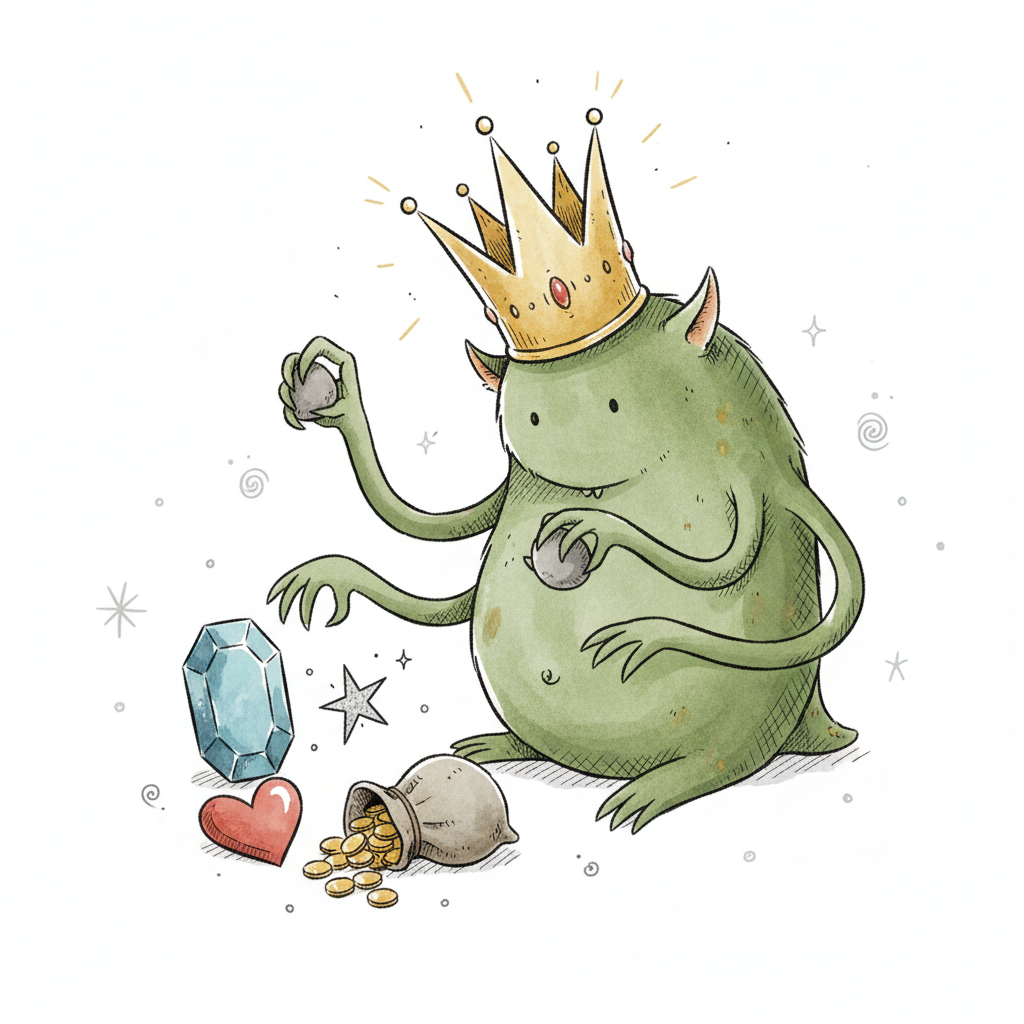 Ein gekröntes grünes Monster mit vier Armen spielt mit Edelsteinen, Herz und Goldmünzen.