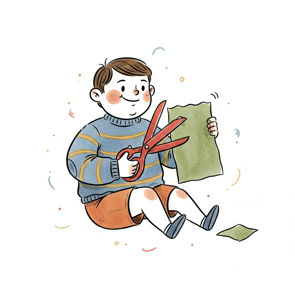 Ein lächelnder Cartoon-Junge sitzt und schneidet grünes Papier mit einer roten Schere.