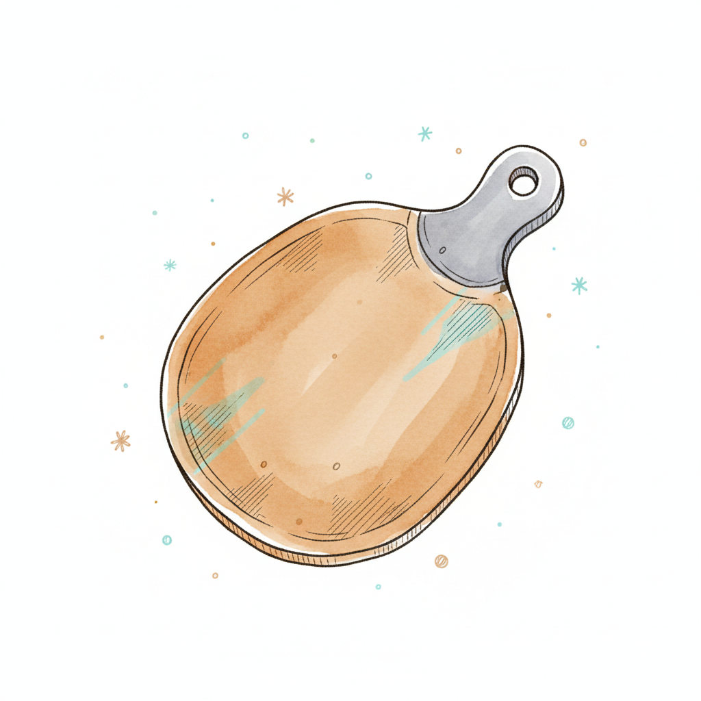 Aquarell-Illustration eines ovalen Holzschneidebretts mit Griff und Loch.