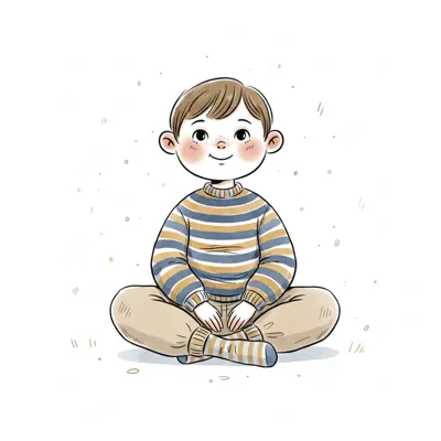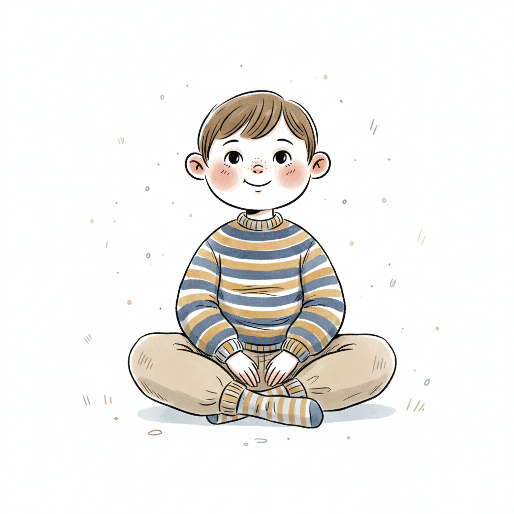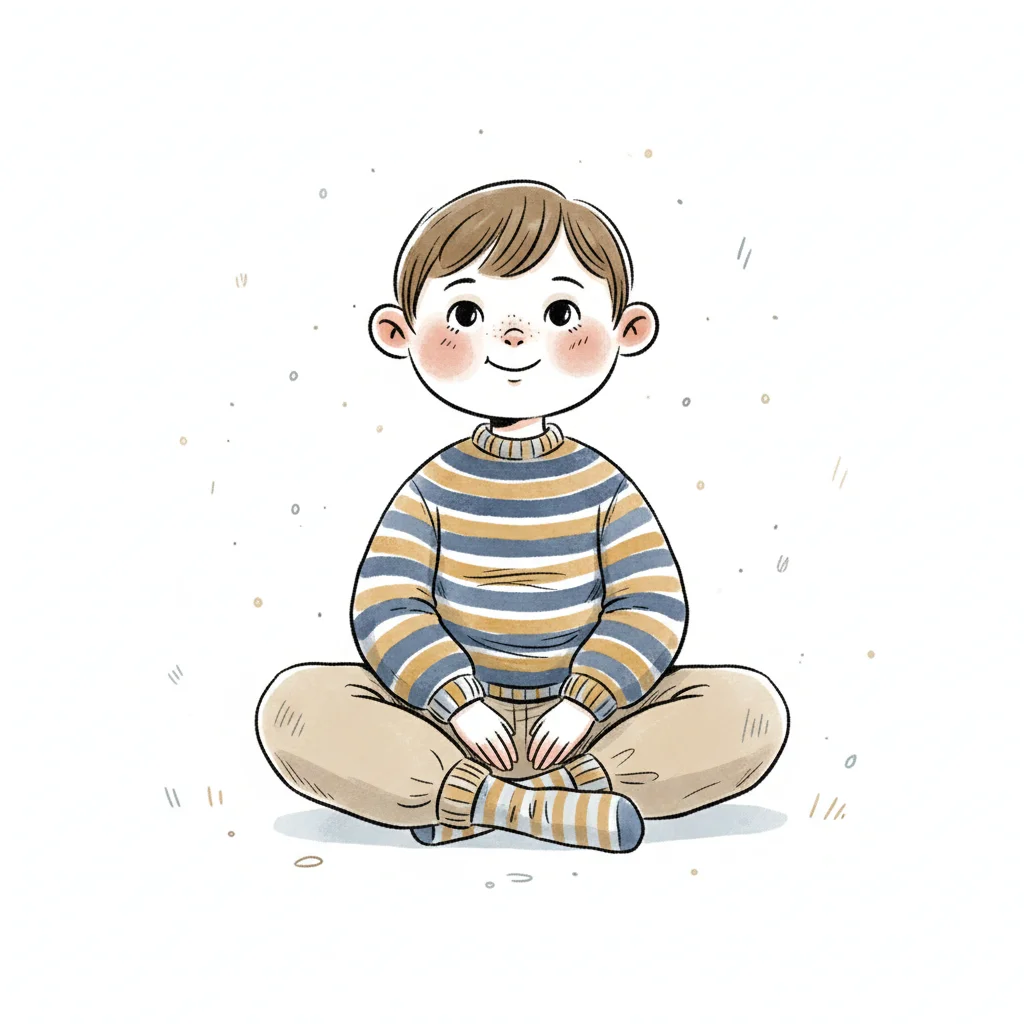 Niedliche Illustration eines lächelnden Jungen im gestreiften Pullover, der im Schneidersitz sitzt.