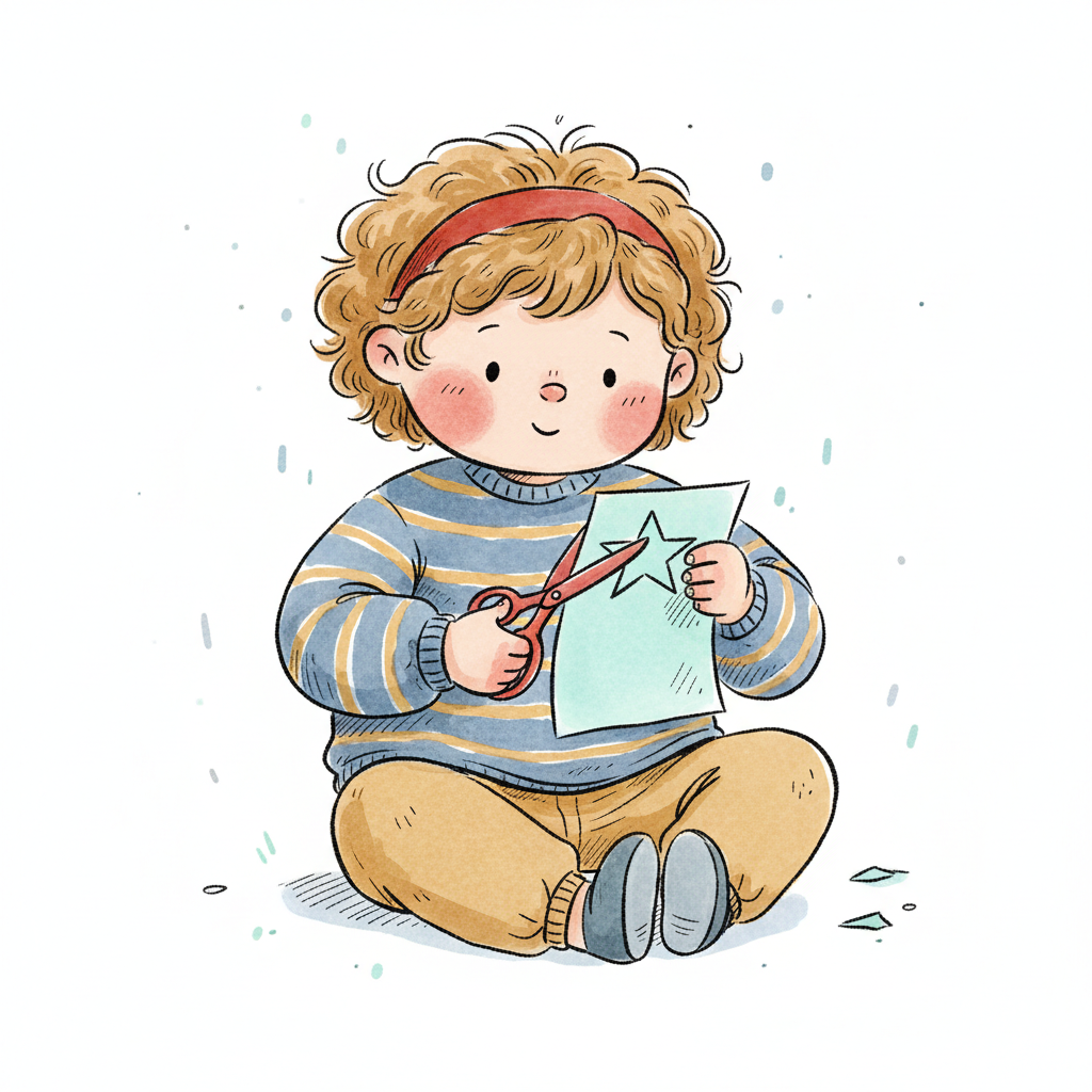 Ein lächelndes Kind mit roten Haaren schneidet Papier mit einer Schere, umgeben von bunten Schnipseln.