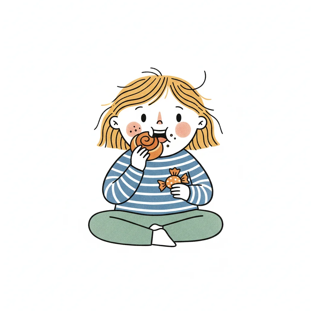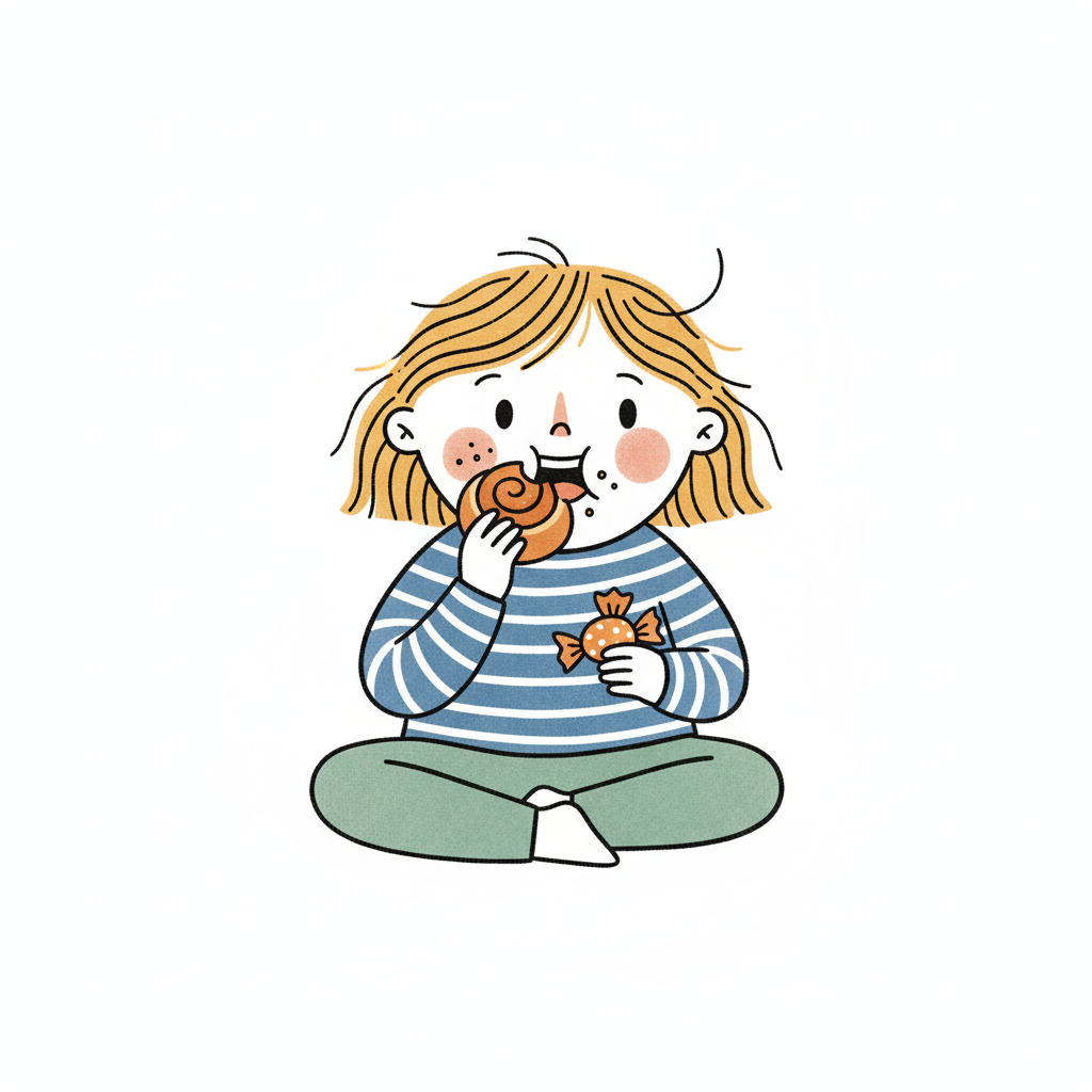 Fröhliches Cartoon-Kind isst genüsslich Gebäck und hält Süßigkeiten, sitzt im Schneidersitz.