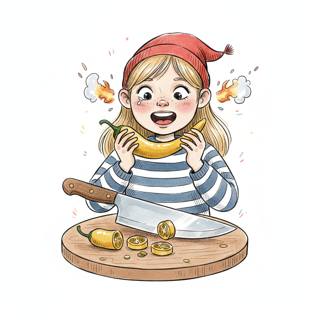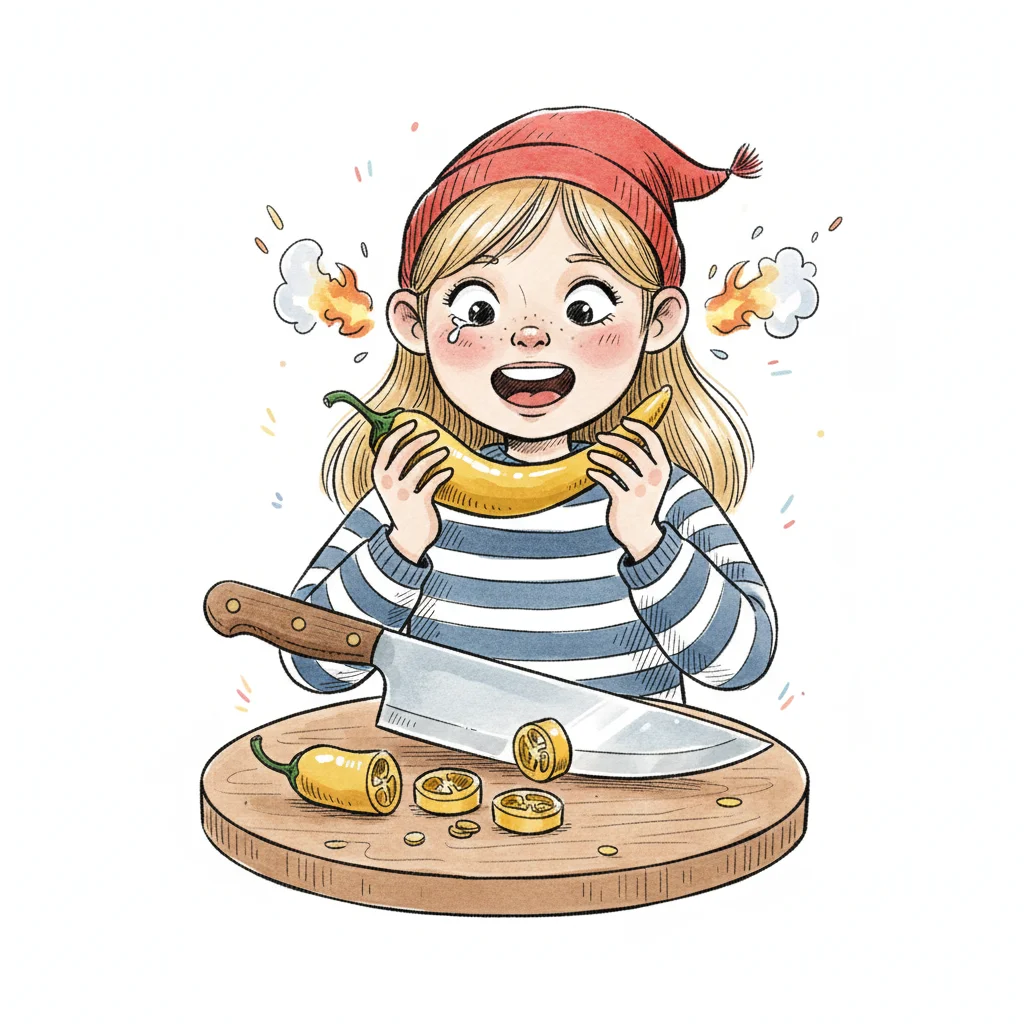 Mädchen mit roter Mütze hält scharfe gelbe Chili, Tränen und Dampf zeigen Schärfe beim Schneiden.