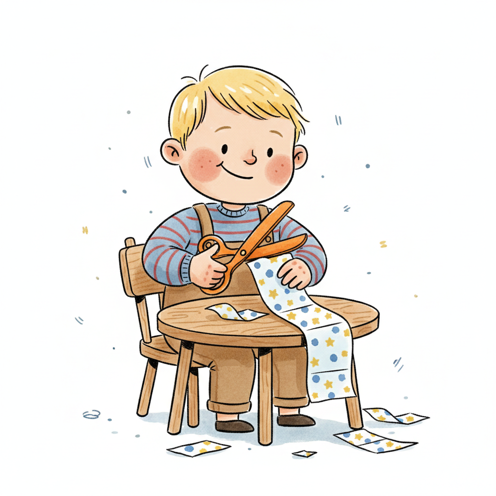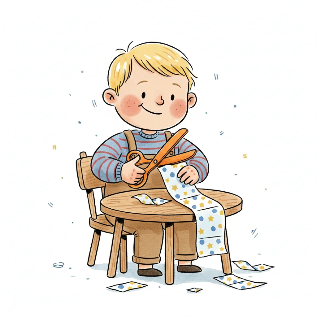 Ein lächelnder Junge sitzt an einem kleinen Tisch und schneidet fröhlich gemustertes Papier.
