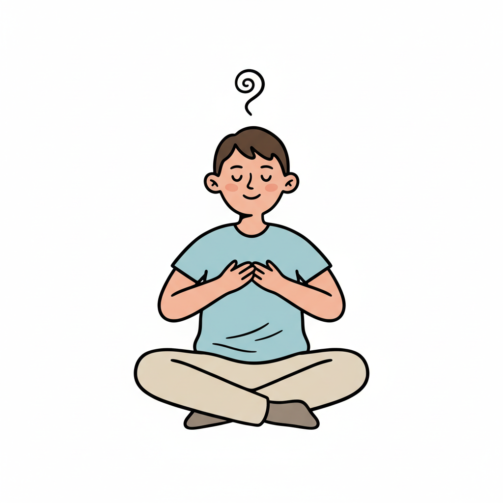 Eine Person meditiert friedlich im Schneidersitz mit Händen auf der Brust und Gedankenwirbel.