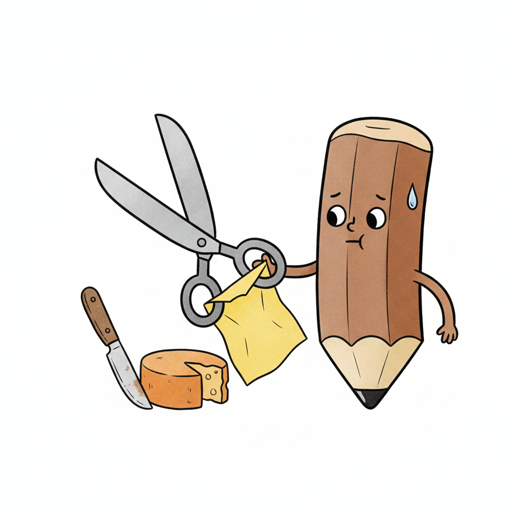 Ein besorgter Cartoon-Bleistift schneidet Papier mit einer Schere, daneben liegen Käse und ein Messer.