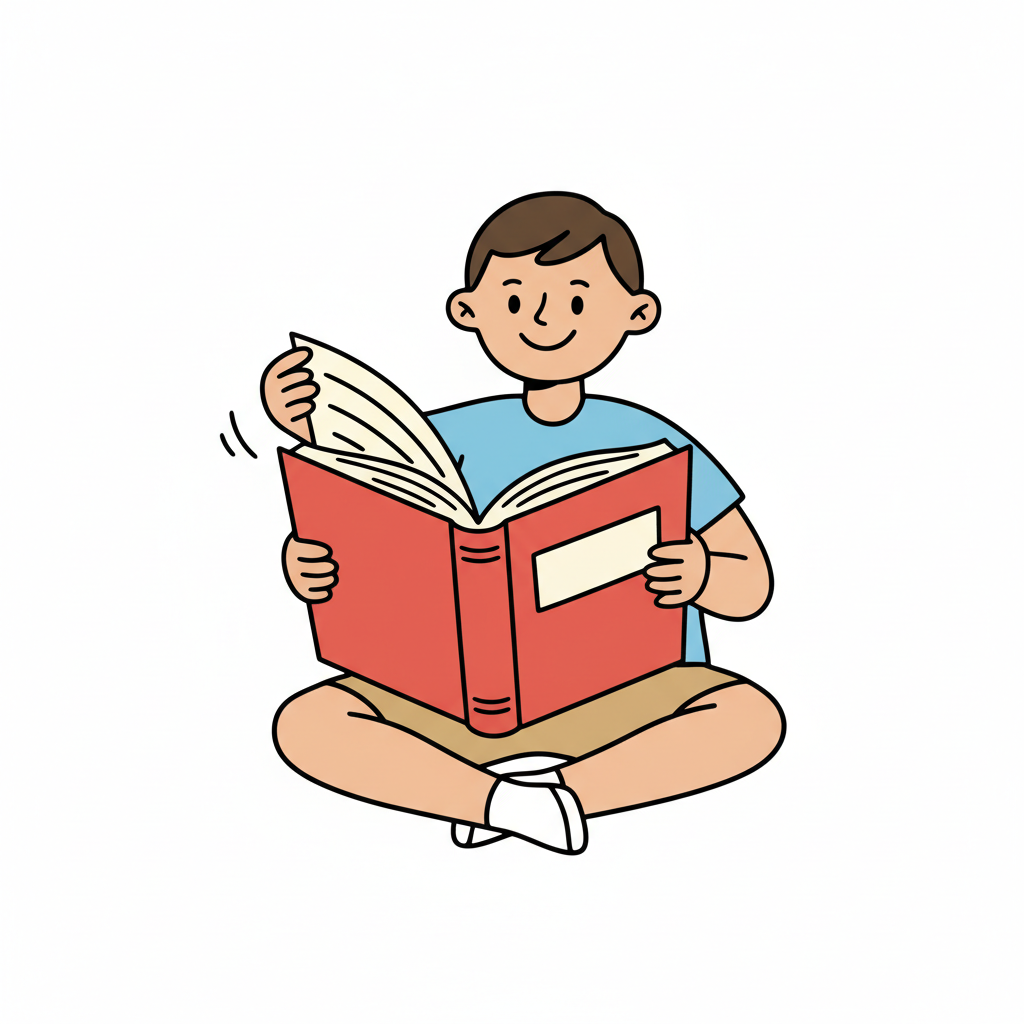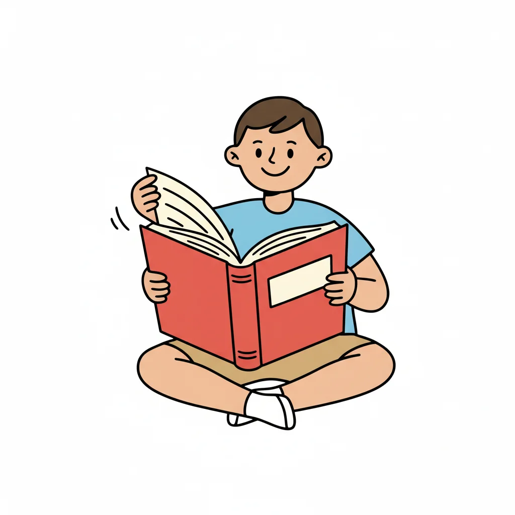 Ein lächelnder Cartoon-Junge sitzt im Schneidersitz und liest ein großes rotes Buch.