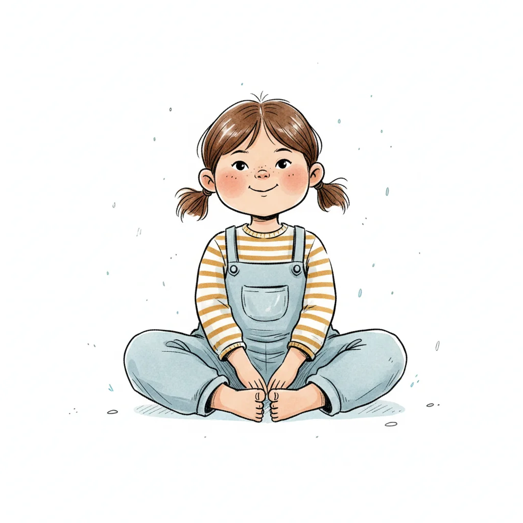 Niedliche, kindgerecht illustrierte Szene mit einem Kind oder einer Person als Hauptfigur, vor rein weißem Hintergrund, im frech-nordischen Aquarell-Skizzenstil. Klare, leicht wackelige Tuschekonturen, sichtbare Pinsel- und Strichtextur, dezente Schraffuren, weiche handgemalte Farbflächen in gedeckten Farben. Einfache, runde Formen. Keine harten Schatten, sondern sanfte, transparente Aquarellschichten. Leicht raue, handgezeichnete Linien statt glatter Vektorkanten. Subtile, vereinzelte Kritzelpunkte oder kleine Details im Hintergrund (wie Pünktchen oder feine Striche), aber keine echte Umgebung oder Landschaft. Die Figur ist mittig zentriert. Insgesamt charmant, humorvoll, warm und handgemacht wirkend. WICHTIG: Das Bild darf ABSOLUT KEINEN TEXT, KEINE BUCHSTABEN und KEINE ZAHLEN enthalten.