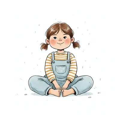 Niedliches Cartoon-Mädchen mit Zöpfen und Latzhose sitzt lächelnd auf dem Boden.