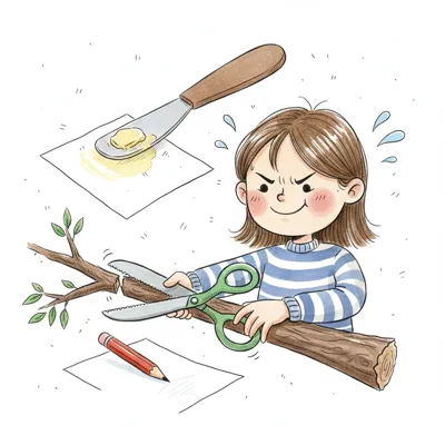 Mädchen schneidet Ast mit Schere, während ein Spachtel Farbe auf Papier verteilt. Falsche Werkzeuge.