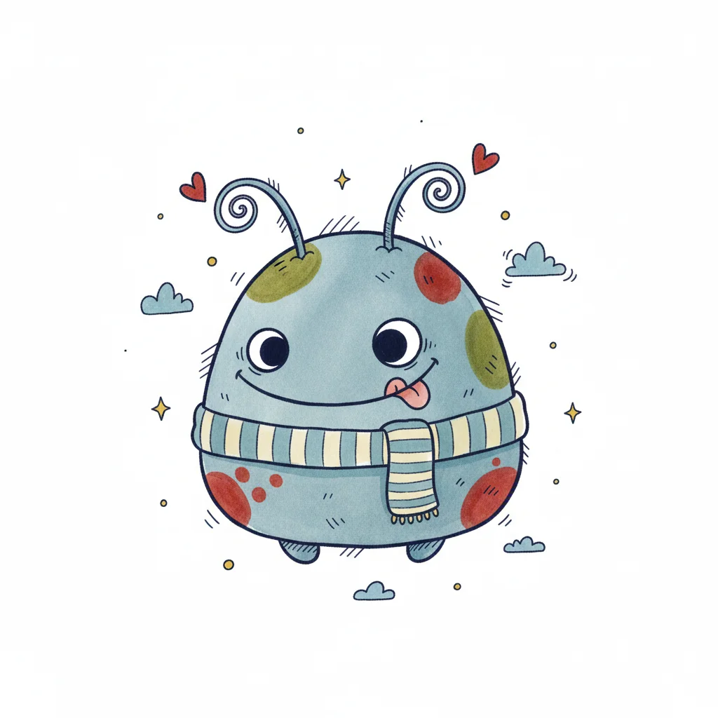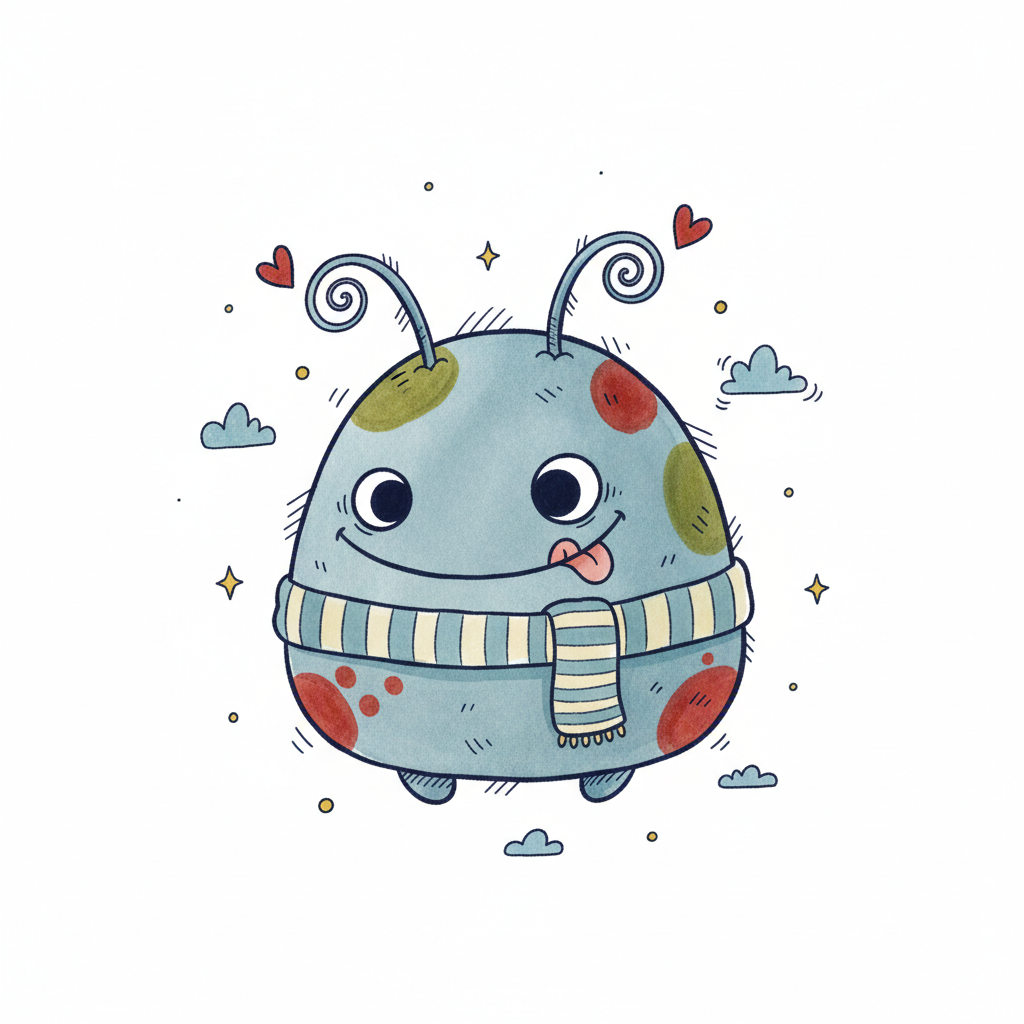 Niedliches, blaues Cartoon-Monster mit Schal, Flecken und Zunge, umgeben von Herzen und Sternen.