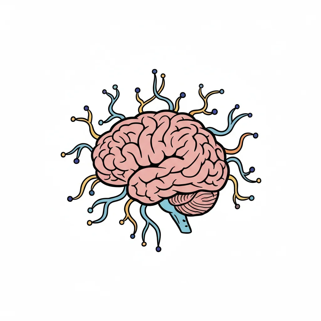 Illustration eines Gehirns mit bunten, verzweigten Verbindungen, die Nerven oder Schaltkreise darstellen.