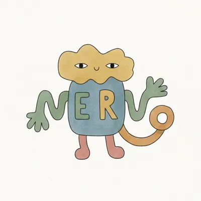 Buntes, cartoonartiges Monster mit "NERVO" auf dem Körper, winkt freundlich.