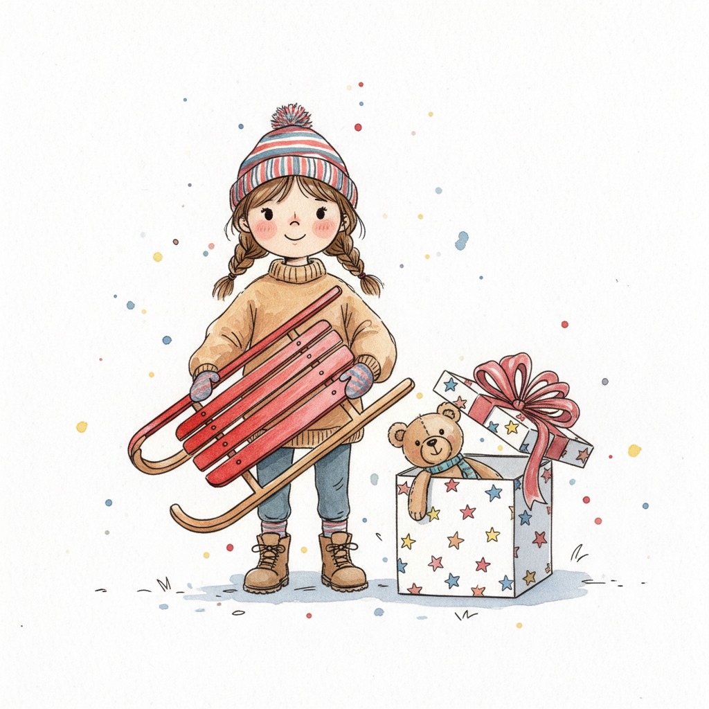 Ein lächelndes Mädchen mit Zöpfen, Winterkleidung und Schlitten, daneben ein Geschenk mit Teddybär.