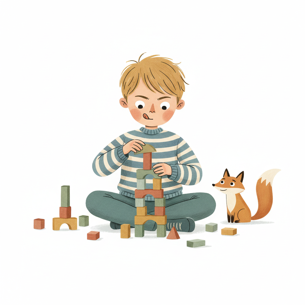 Ein Junge baut mit bunten Blöcken, begleitet von einem neugierigen Fuchs.