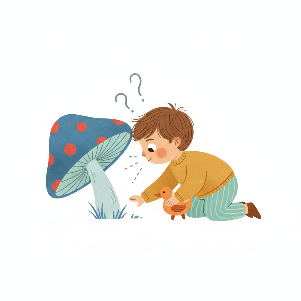 Ein Kind betrachtet neugierig einen großen, bunten Pilz.