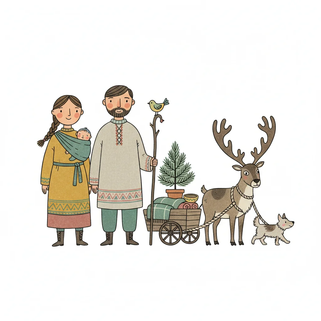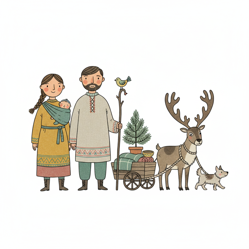 Niedliche Illustration einer Familie mit Baby, Rentier, Hund und Wagen in folkloristischer Kleidung.