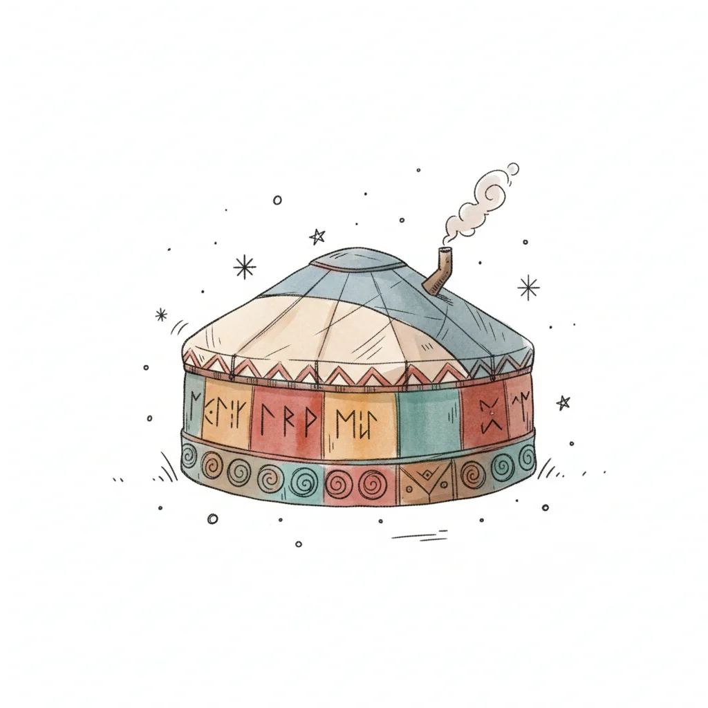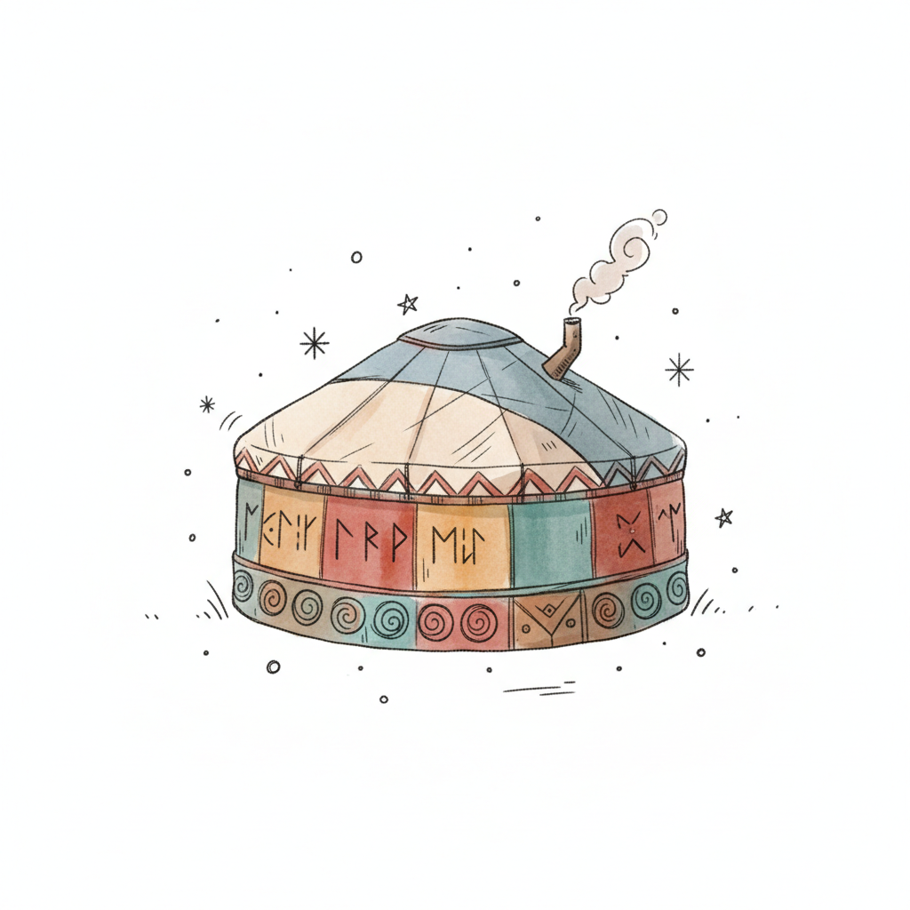 Aquarell-Jurte mit bunten Paneelen, Runen und rauchendem Schornstein, umgeben von Sternen.