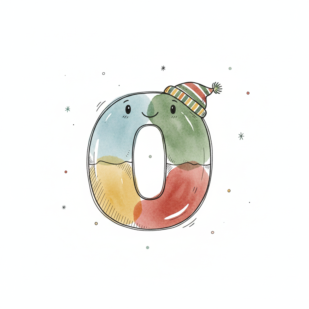 Bunte Aquarell-Illustration der Zahl 0 mit schwarzem Umriss und abstrakten Hintergrundelementen.